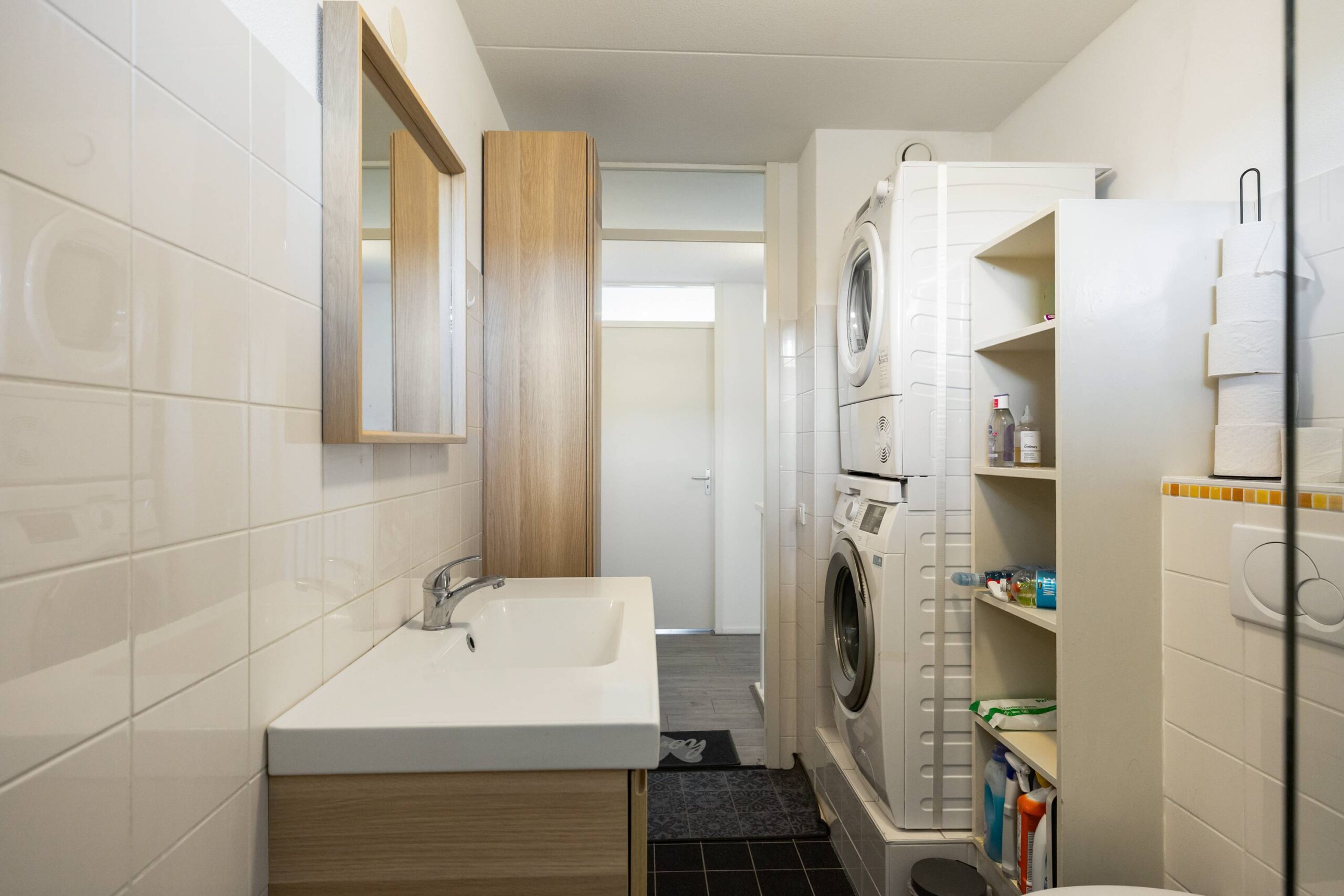 Overloop, toegang tot 3 slaapkamers en een badkamer. De badkamer heeft een wastafelmeubel, een extra wandkast, een inloopdouche, een tweede zwevend toilet en een aansluiting voor de wasmachine. De ruimte heeft zowel natuurlijke als mechanische ventilatie.