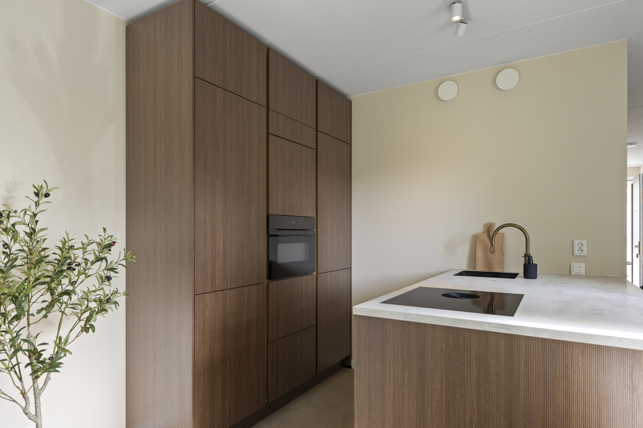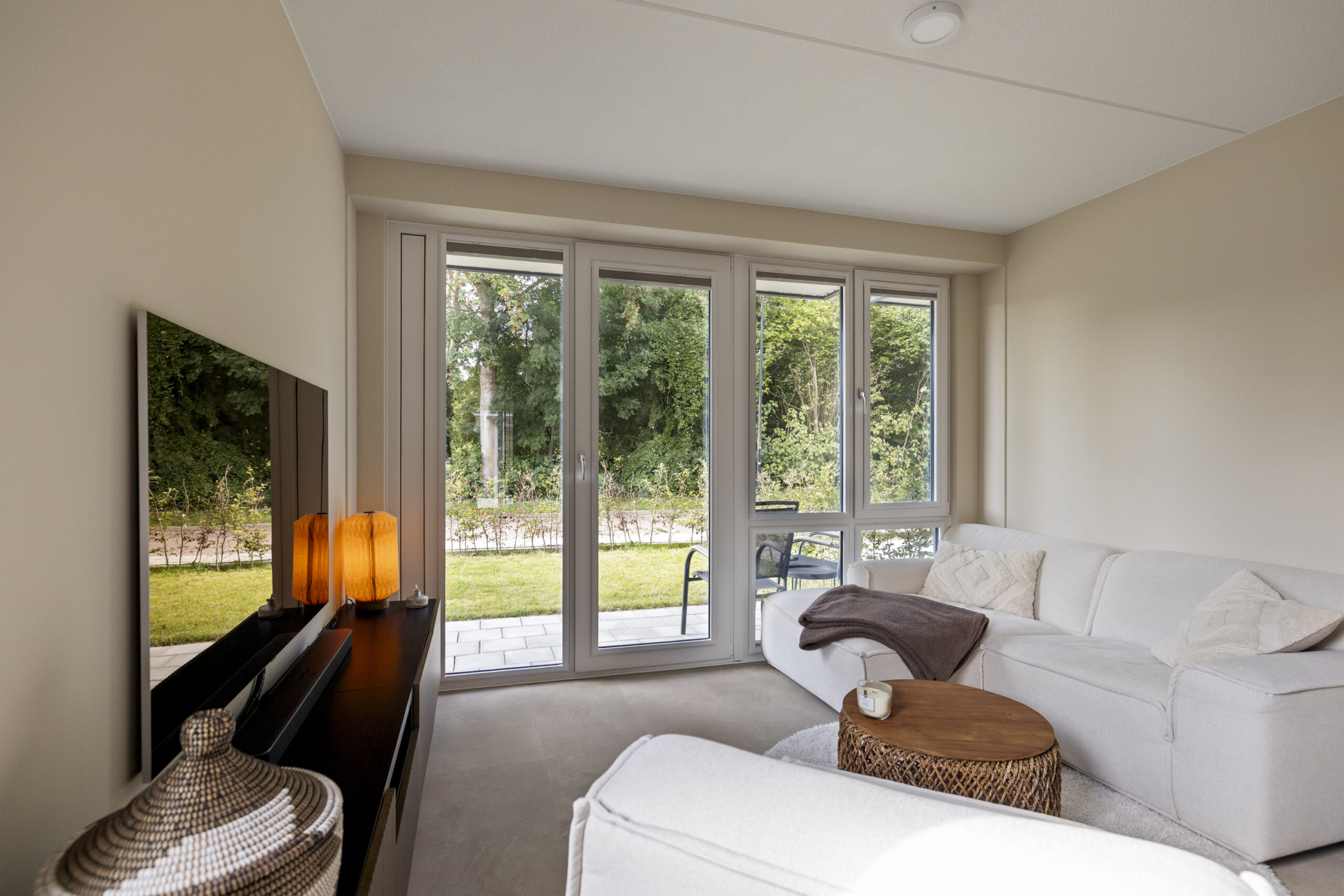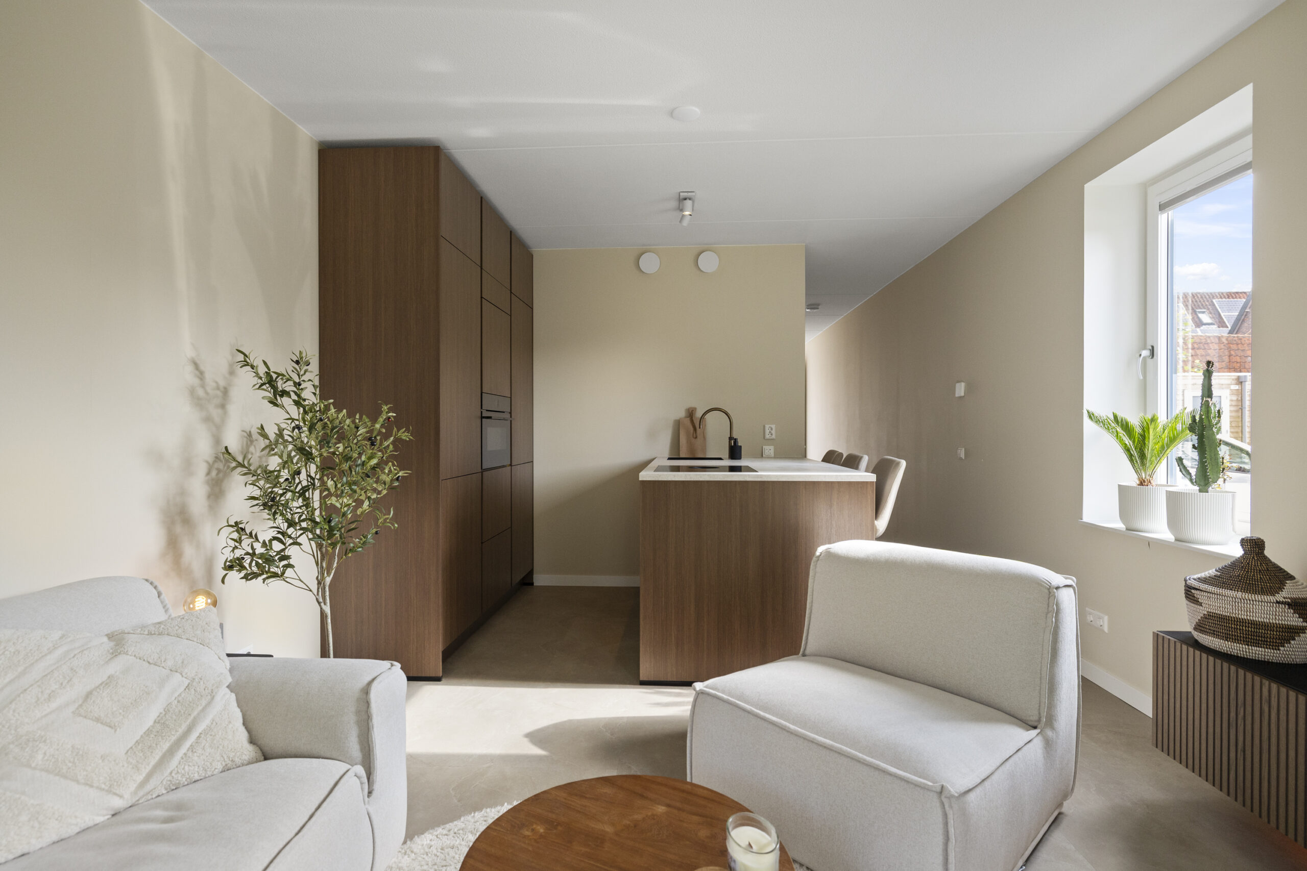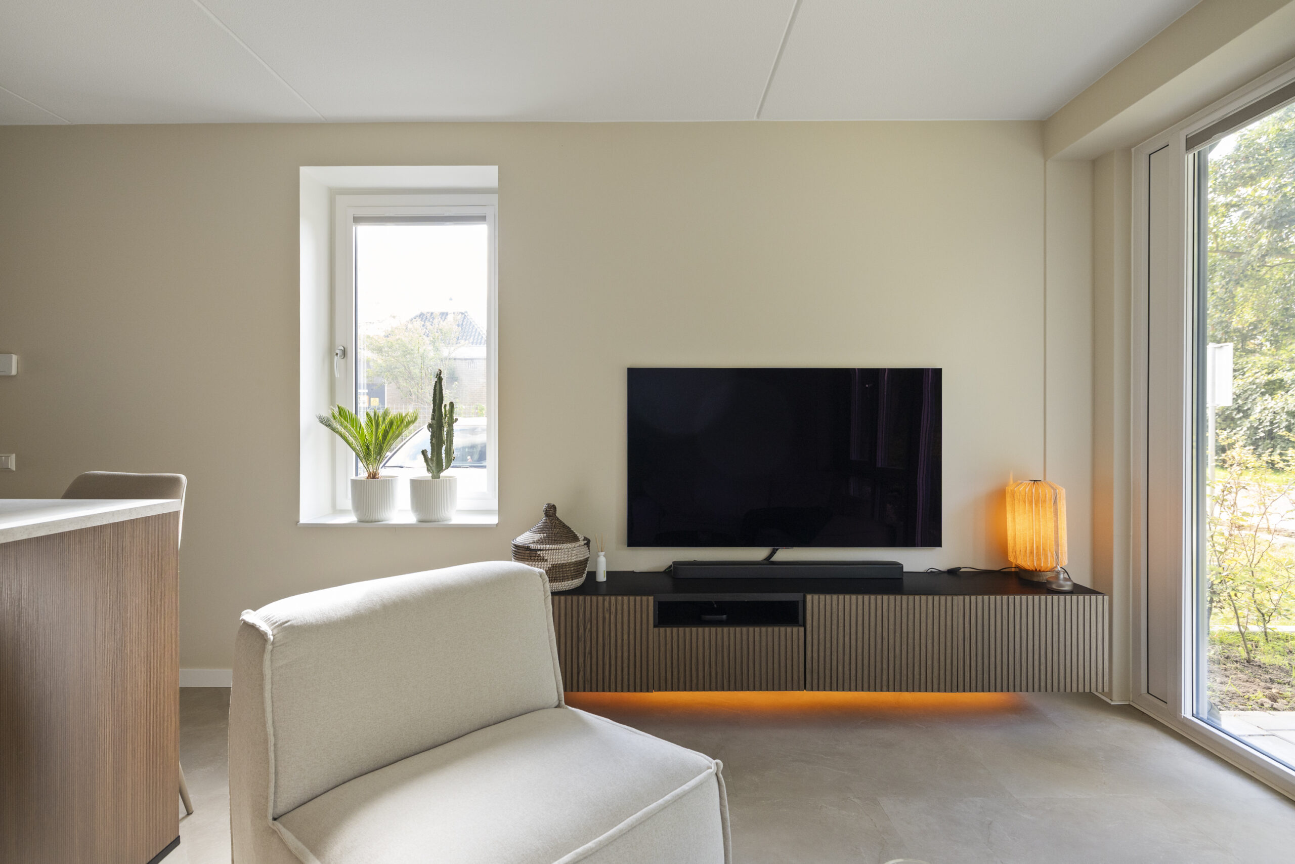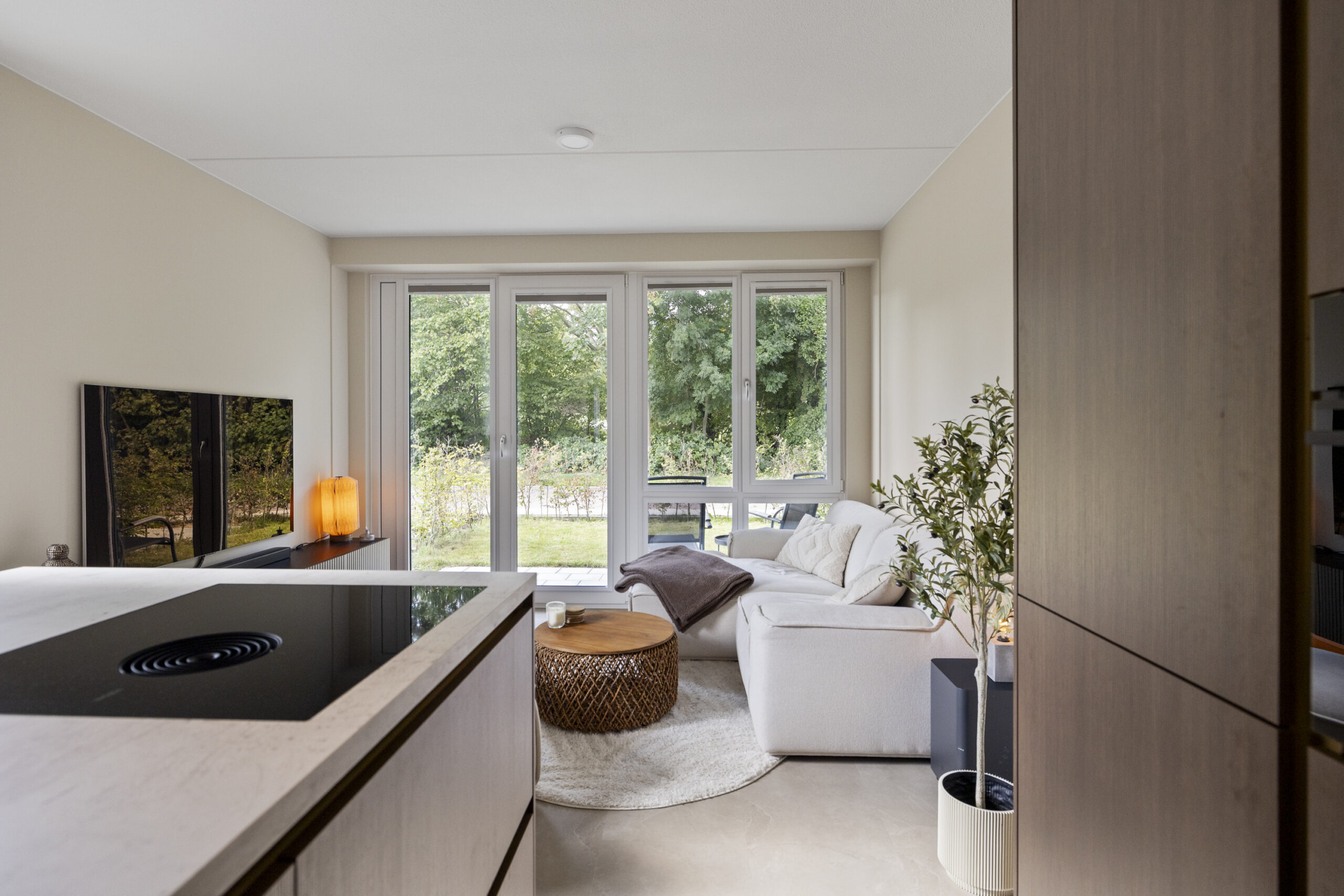 Entree, hal, meterkast, slaapkamer, moderne badkamer inloopdouche, vrijdragend toilet, wastafel en aansluiting voor de wasmachine/droger. Woonkamer met tuindeuren naar het terras. Luxe open keuken met diverse inbouwapparatuur: Koelkast, vrieskast, 4- pits inductie kookplaat met Bora afzuigsysteem, vaatwasmachine en Quooker.