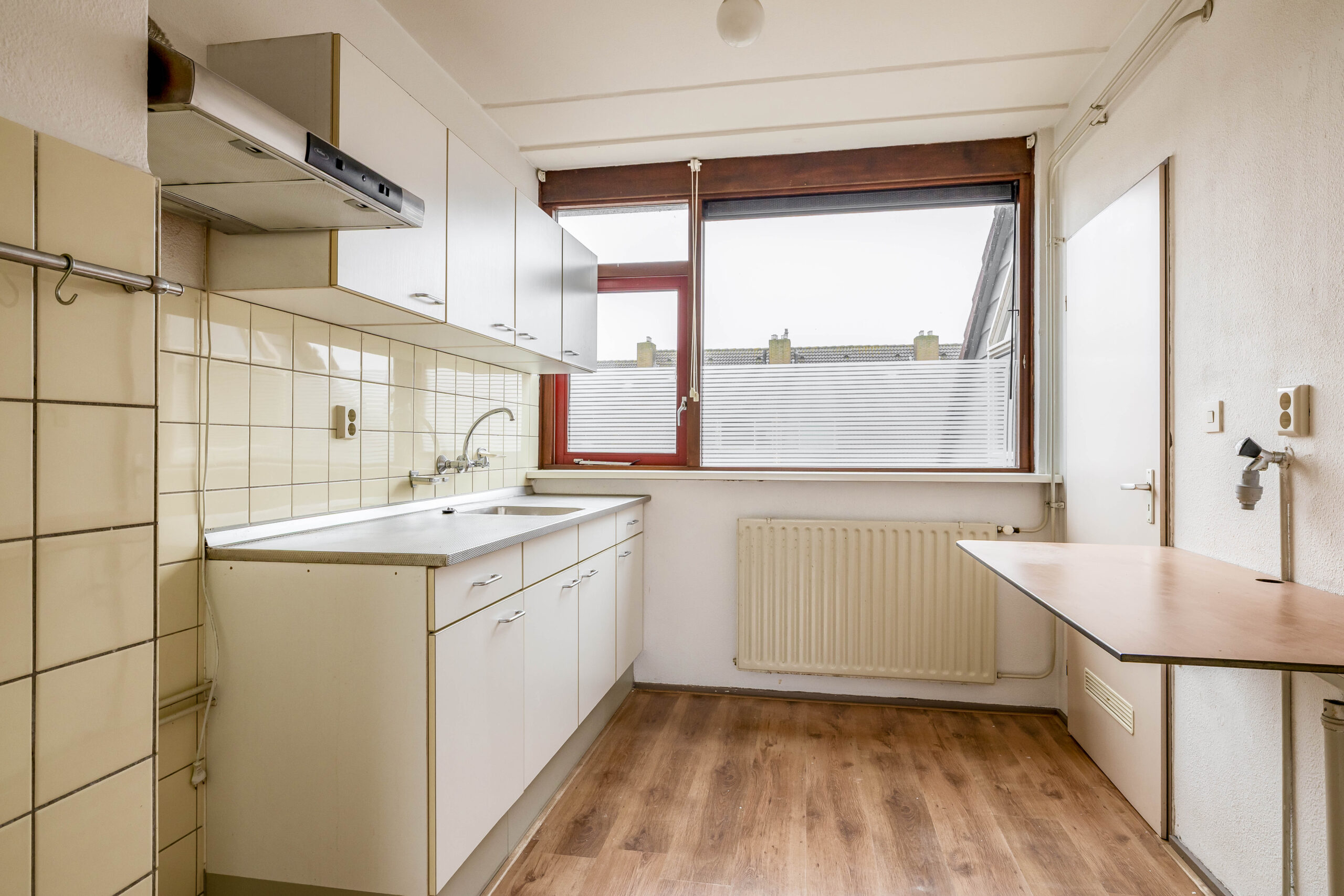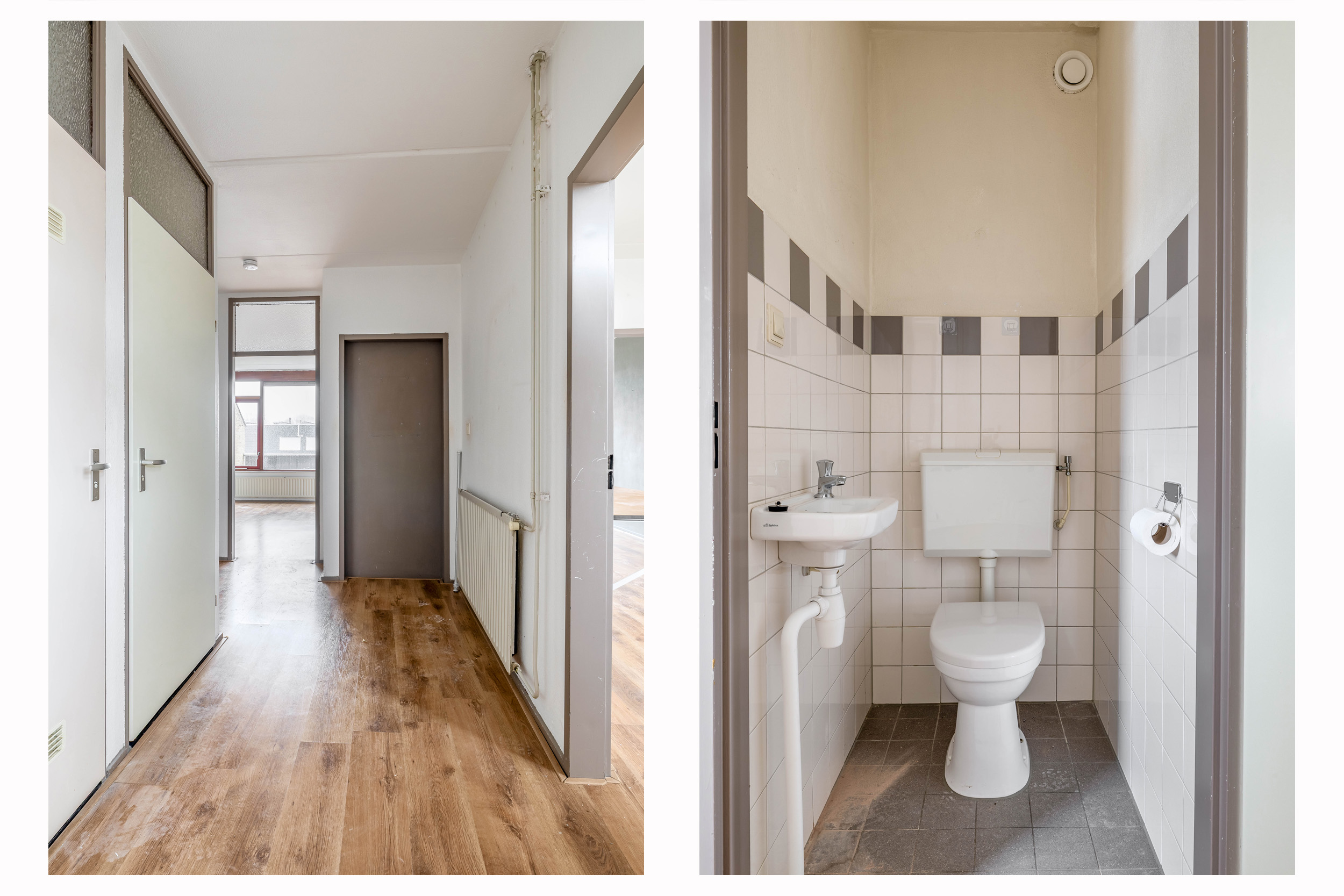 1e verdieping: Overloop voorzien van laminaatvloer, volledig betegelde badkamer met wastafel en douche, toiletruimte met fontein, zeer ruime woonkamer voorzien van nette laminaatvloer met deur naar breed balkon, keuken voorzien van veel daglicht, laminaatvloer en eenvoudige keukenopstelling met afzuigkap. Balkon gelegen op het noordoosten.