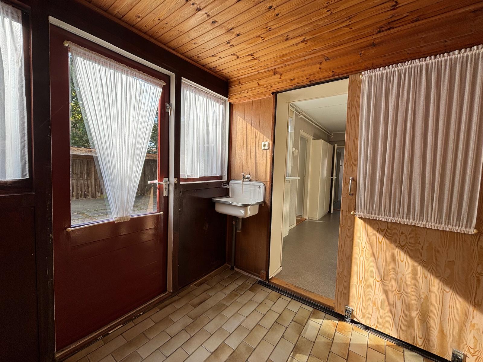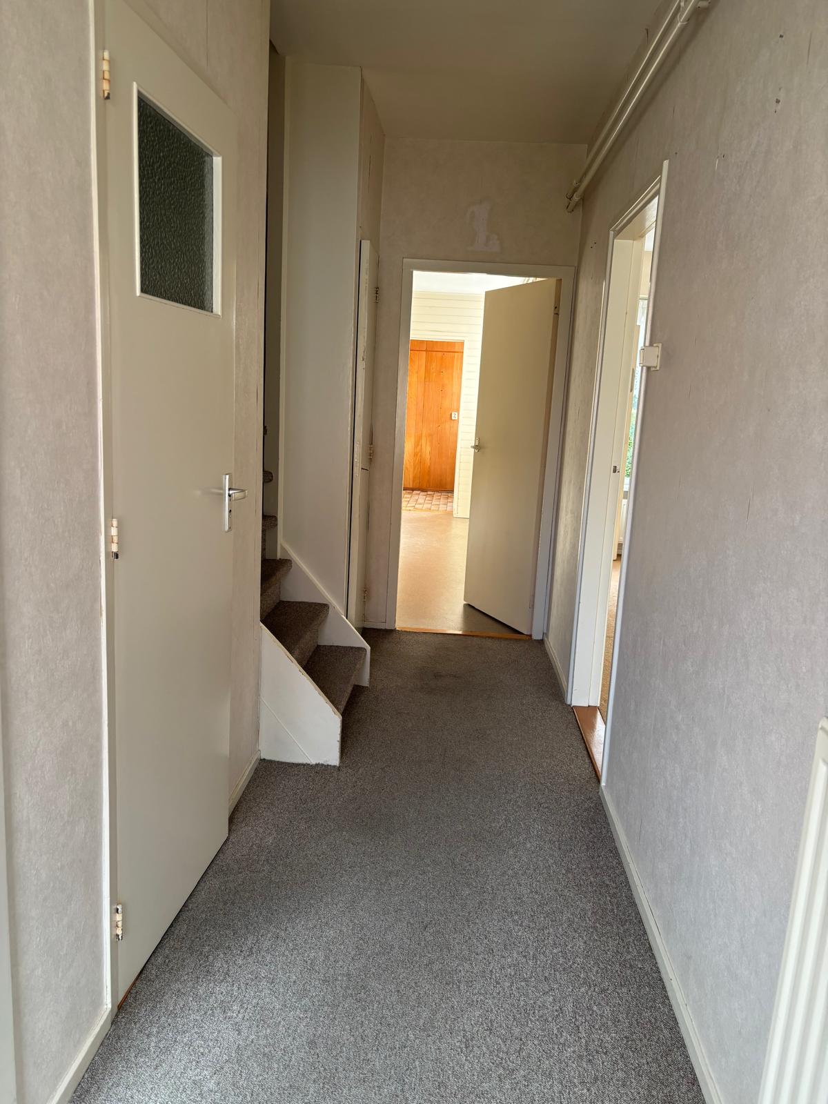 Entree, gang, deels betegelde toiletruimte, trapkast, meterkast, vaste trap naar 1e verdieping, doorzonwoonkamer, royale dichte keuken met eenvoudige keukenopstelling en opstelling CV-ketel (2018), bijkeuken met stortbakje en met wasmachine aansluiting.