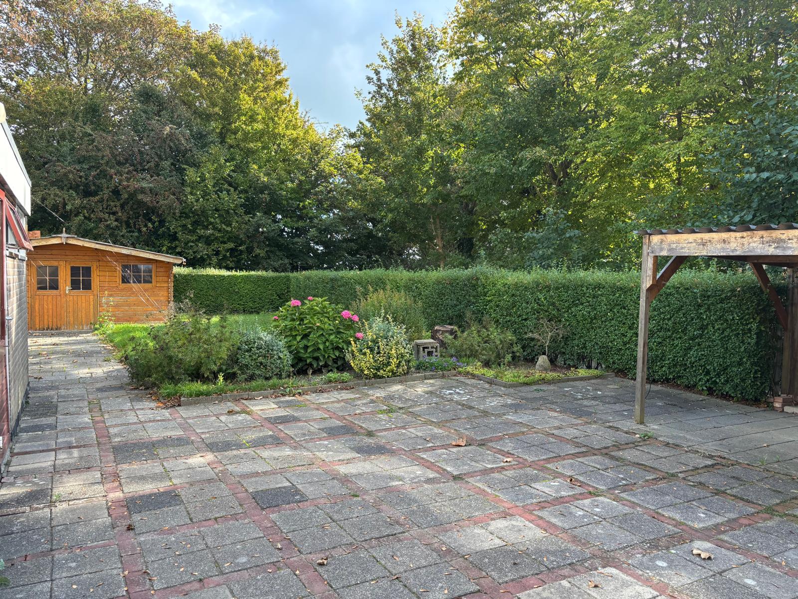 Achtertuin gelegen op het Oosten voorzien van aangebouwde stenen berging, groot vrijstaand houten tuinhuis en nog een grote overkapping, terras en achterom.