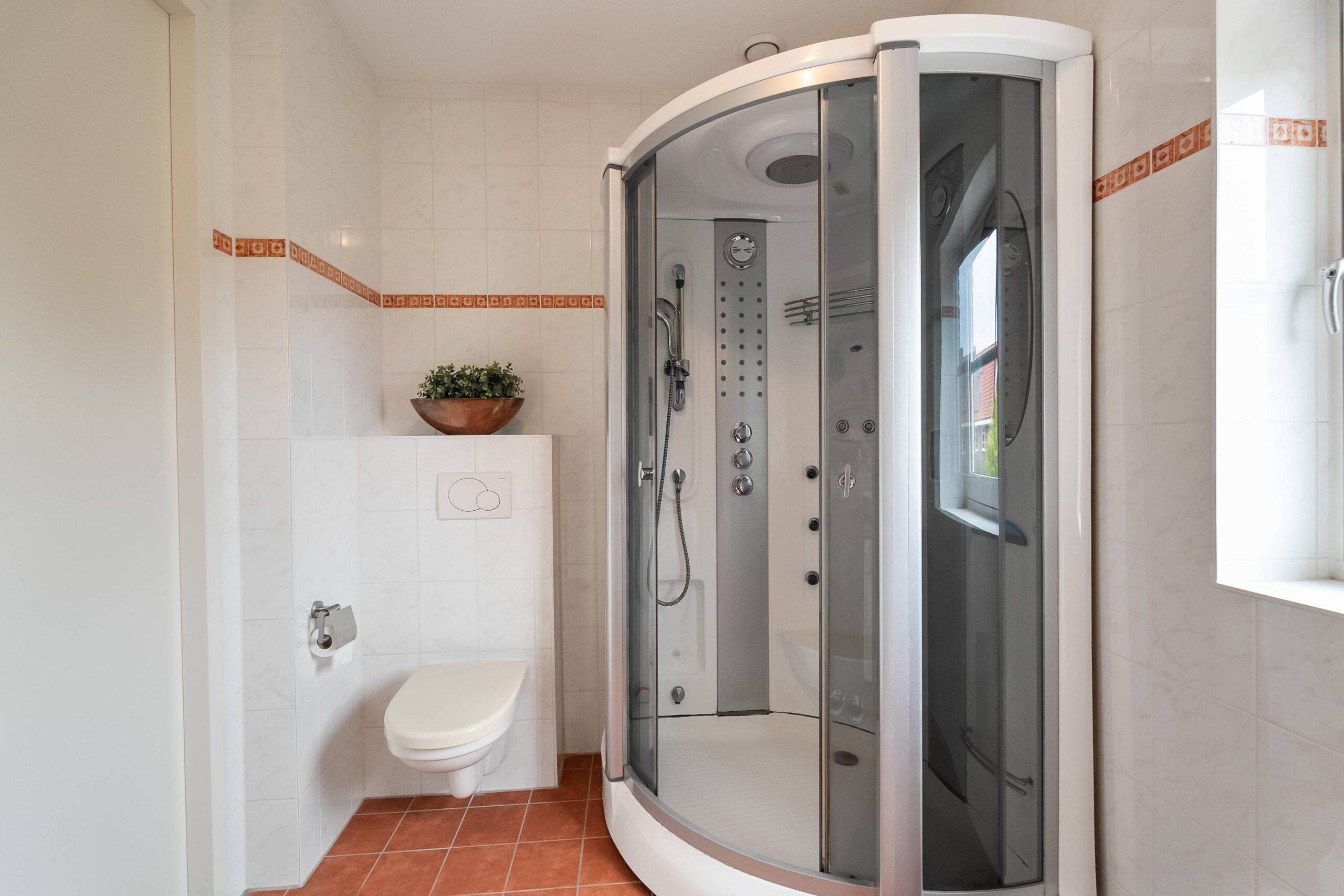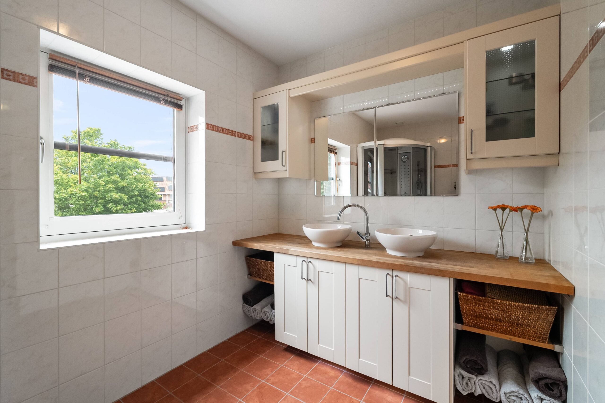 Eerste verdieping: overloop, 3 comfortabele slaapkamers waarvan één met vaste kast, praktische bergruimte met aansluiting voor de wasmachine, ruime complete badkamer met douchecabine, vrijdragend toilet en wastafelmeubel met dubbele wastafel.