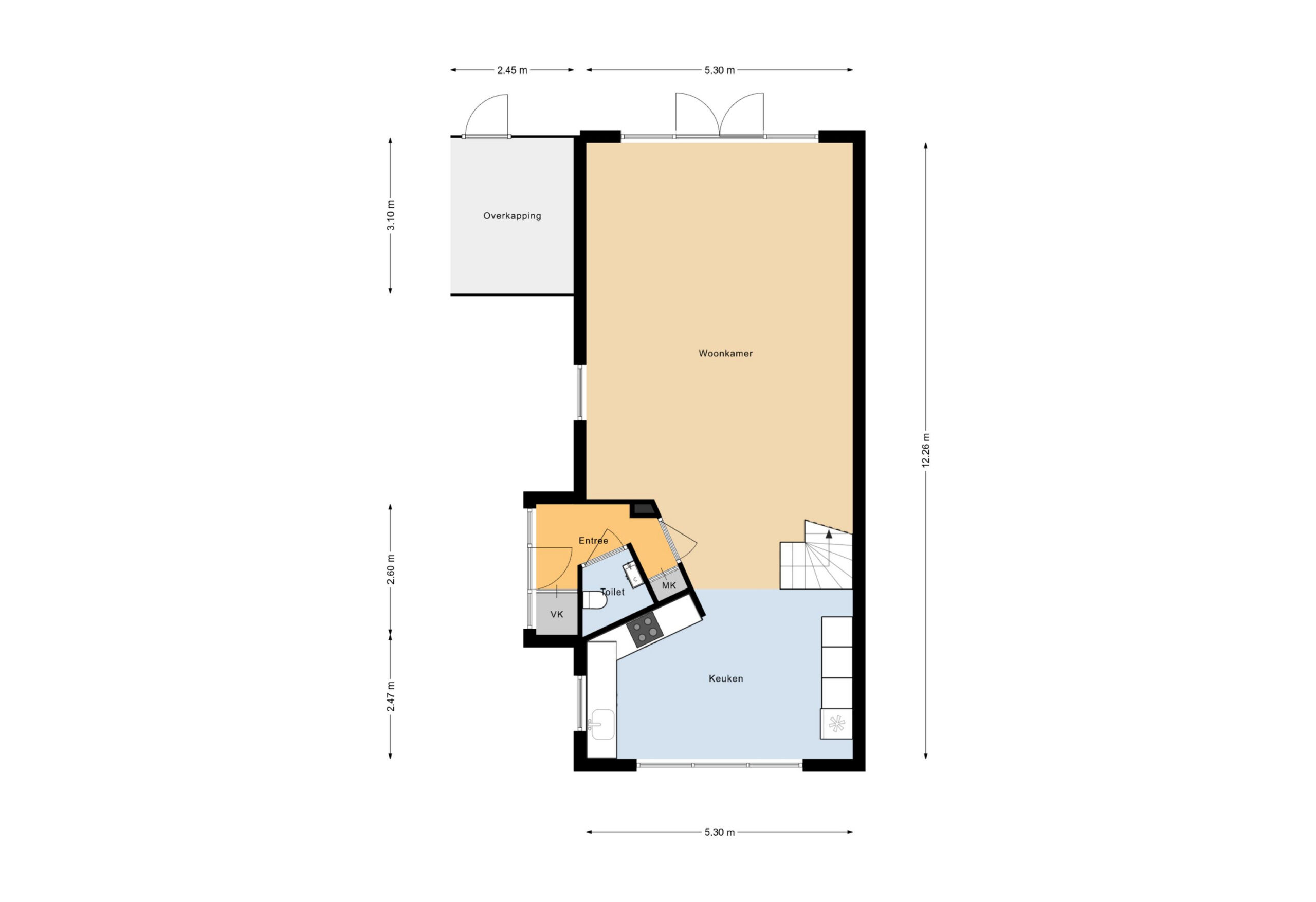Begane grond: zijentree met garderobe en meterkast, volledig betegelde toiletruimte met vrijdragend toilet en fontein, tuingerichte woonkamer met openslaande deuren naar de sfeervolle tuin met veranda en overkapping, open keuken in hoekopstelling met diverse inbouwapparatuur. Vanuit de woonkamer de trap naar de eerste verdieping.