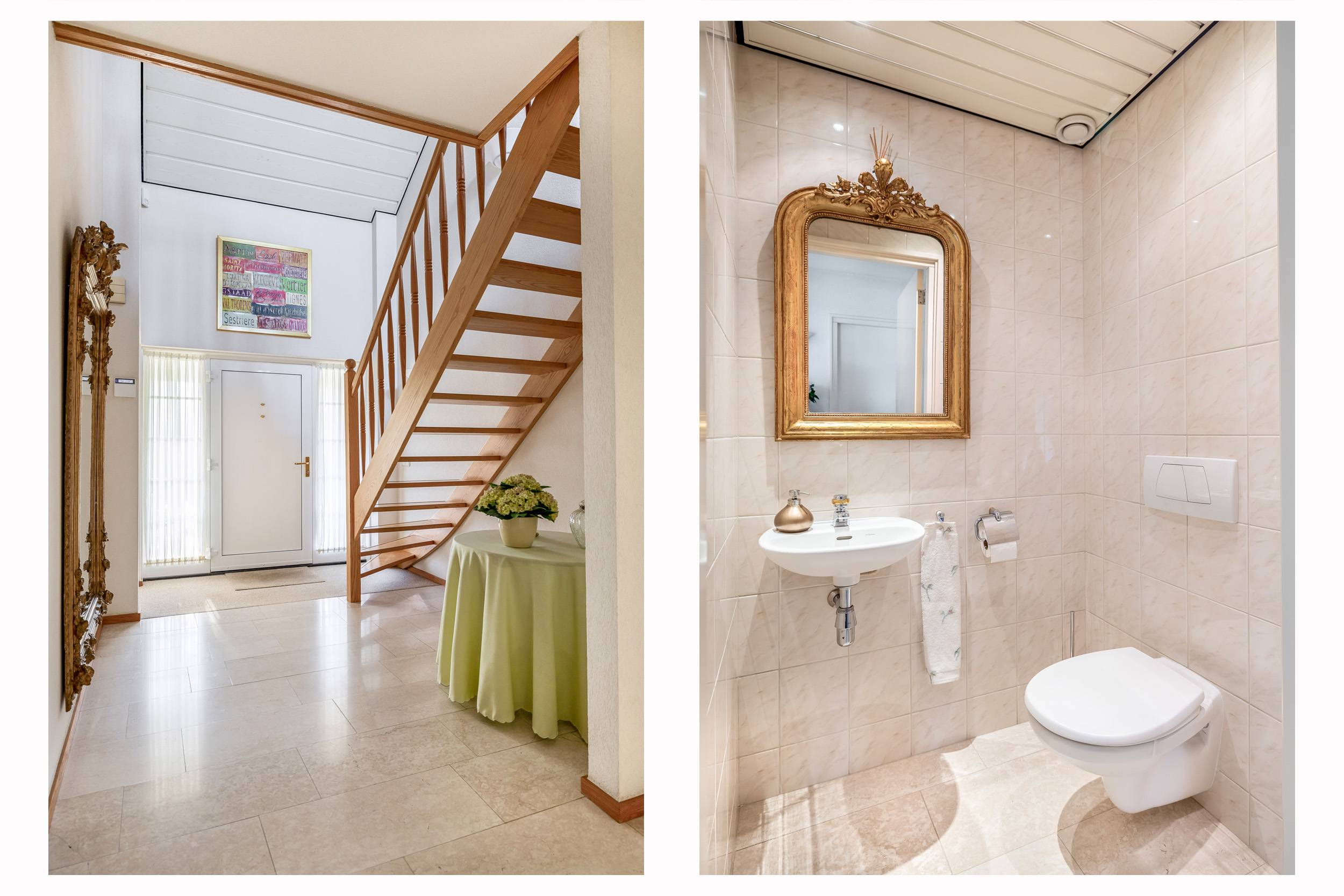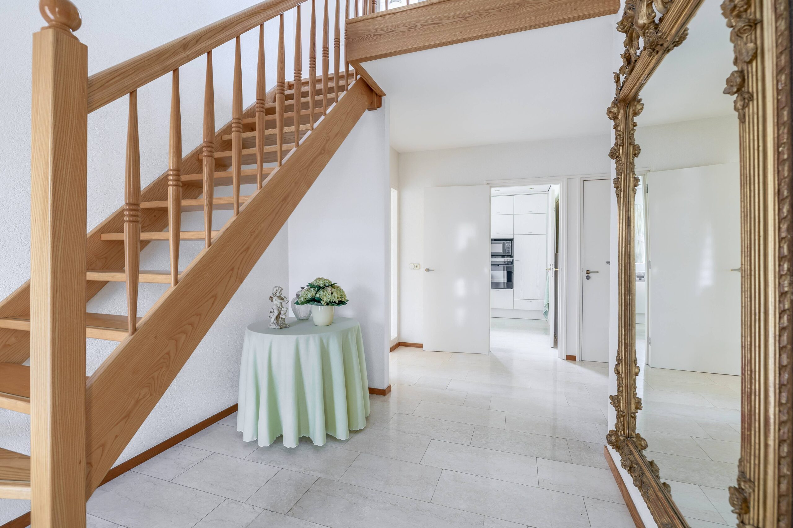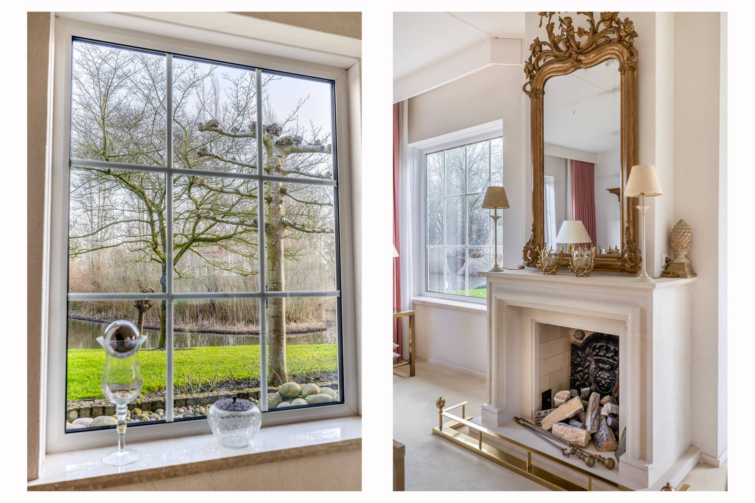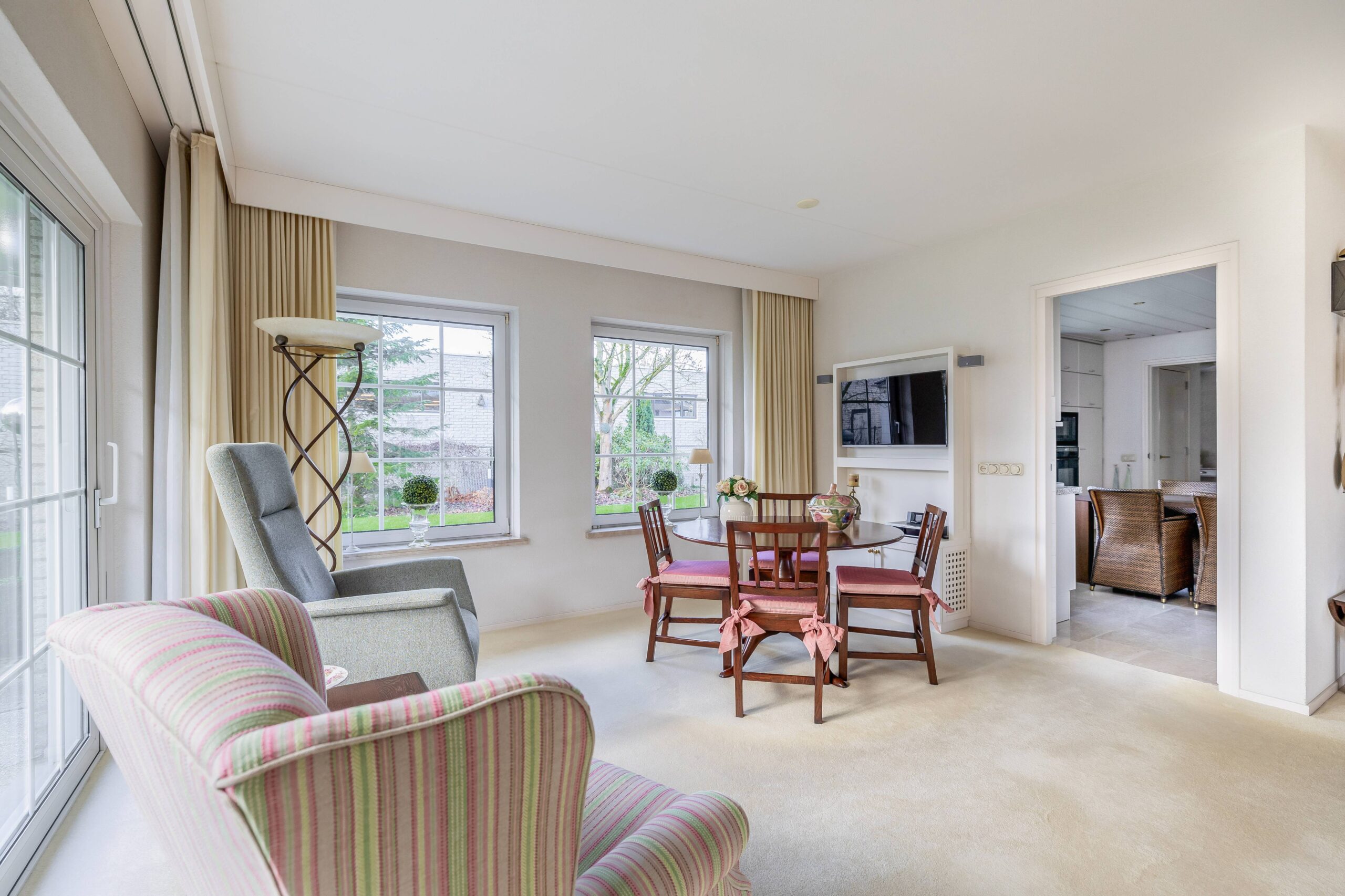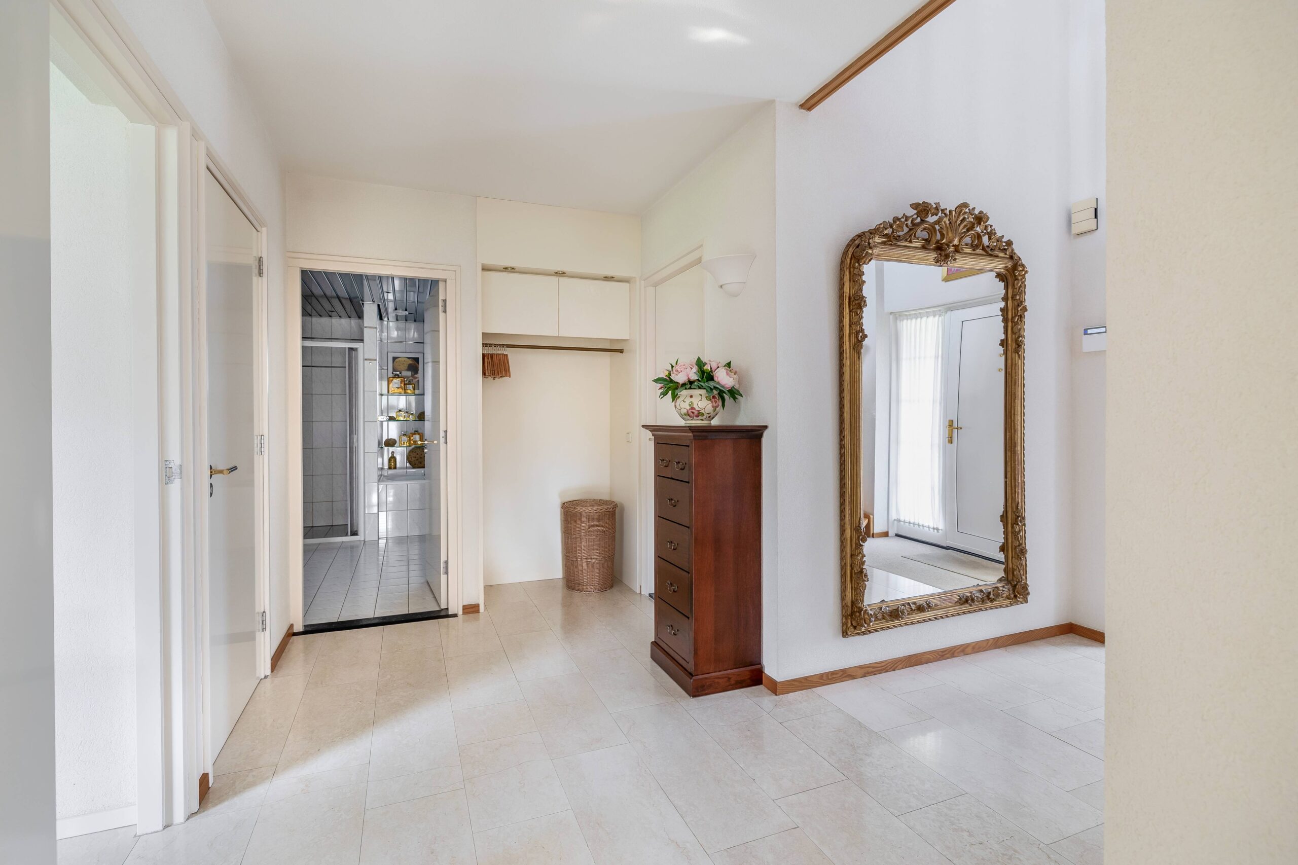 Entree, bijzonder ruime hal met vide, meterkast, toiletruimte met vrijdragend toilet en fontein. Slaapkamer met vaste kastenwand en badkamer en-suite. Badkamer met ligbad, douche, vrijdragend toilet, dubbel wastafelmeubel en vloerverwarming. De badkamer is zowel vanuit de slaapkamer als vanuit de hal bereikbaar. Ruime en lichte woonkamer met sfeervolle haard en schuifpui naar de tuin.