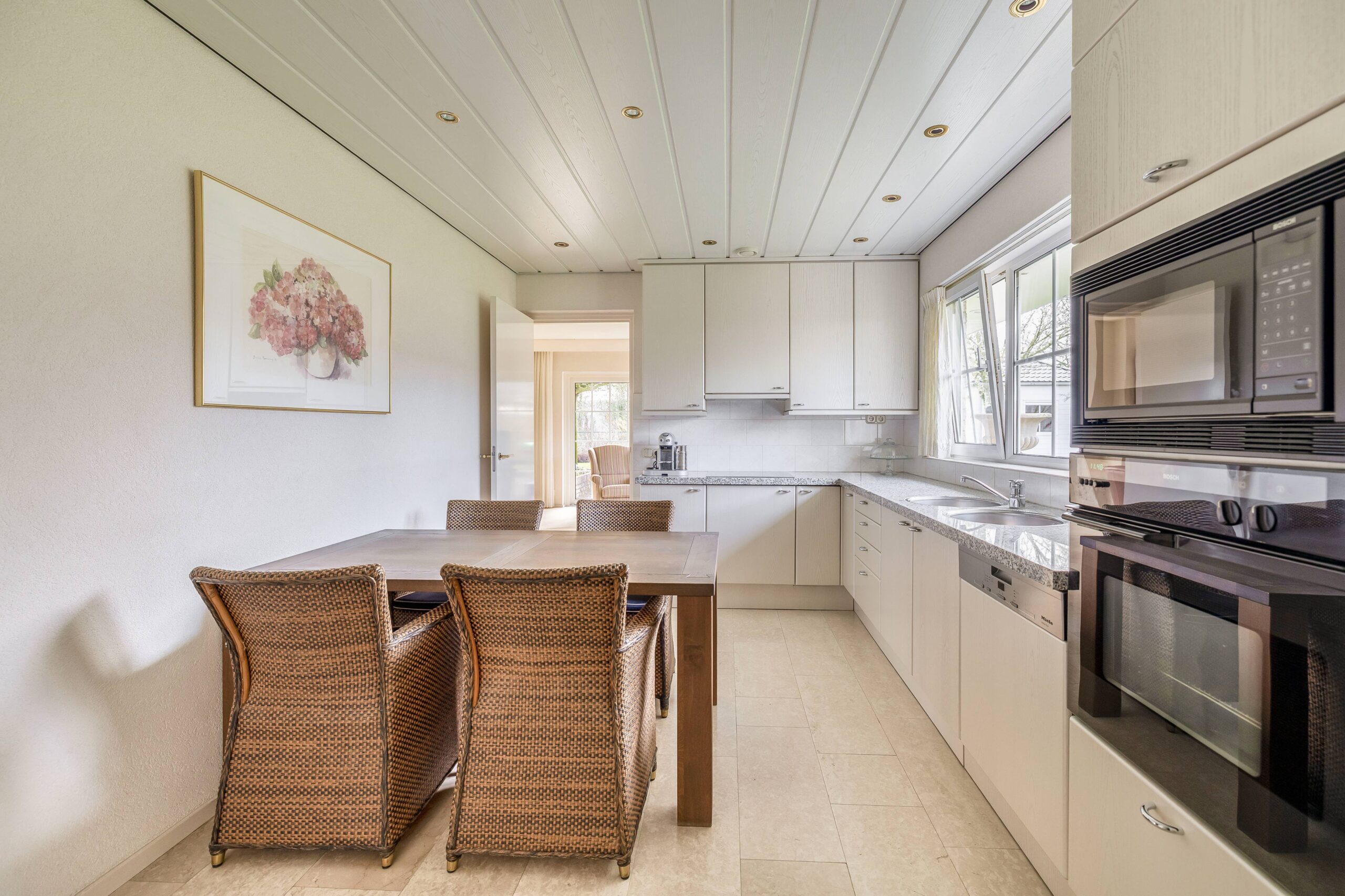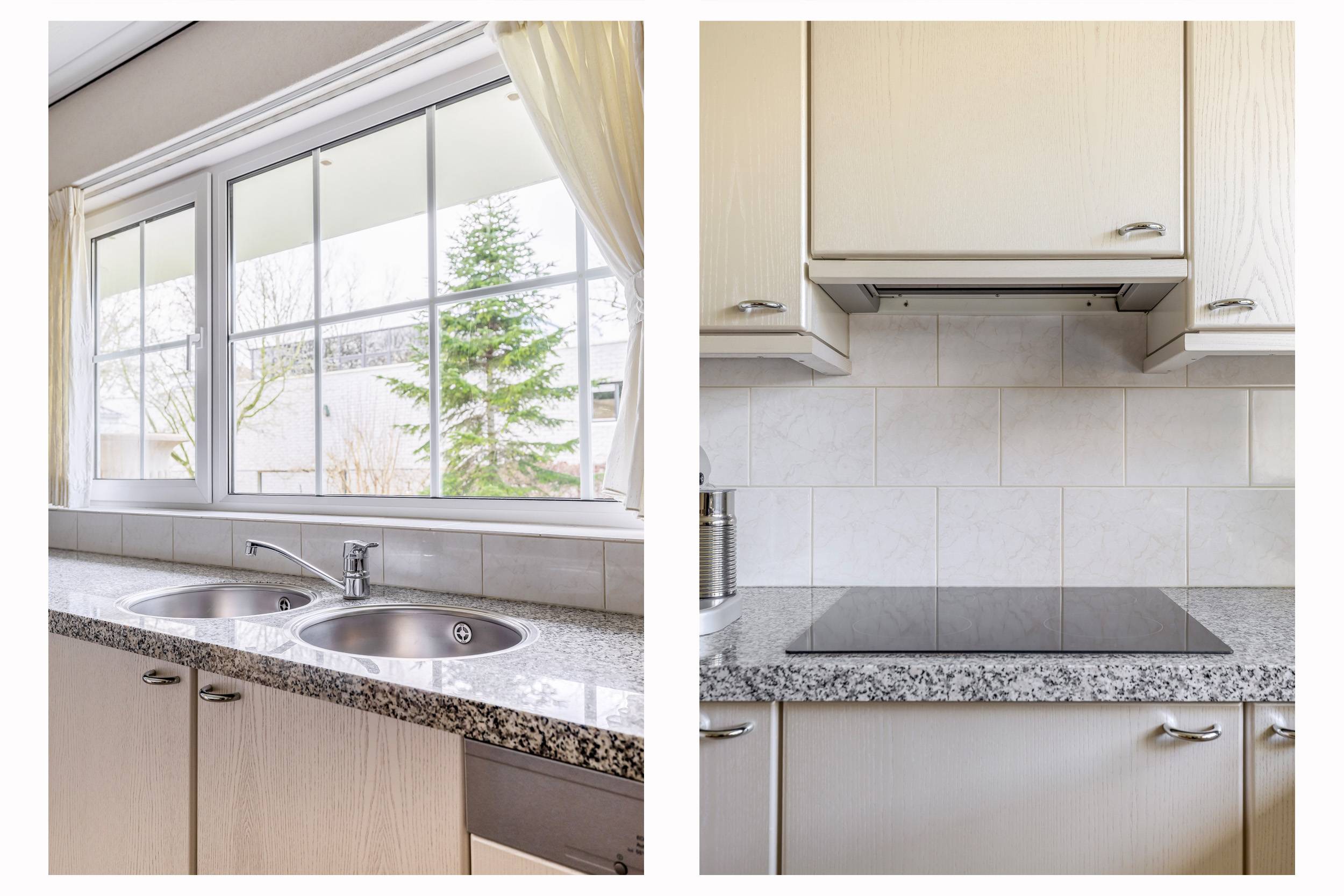 Dichte eetkeuken met L-opstelling welke is voorzien van diverse inbouwapparatuur zoals: Koelkast, 4-zones inductie kookplaat, dubbele spoelbak, oven, magnetron, vaatwasmachine en afzuigkap. Vanuit de keuken komt u in de bijkeuken met ruime bergkast en nattegroep opstelling, toegang tot een kantoor/hobby ruimte of kleine slaapkamer met vaste kasten. Tevens is de de garage met toegang tot de tuin vanuit de bijkeuken bereikbaar.