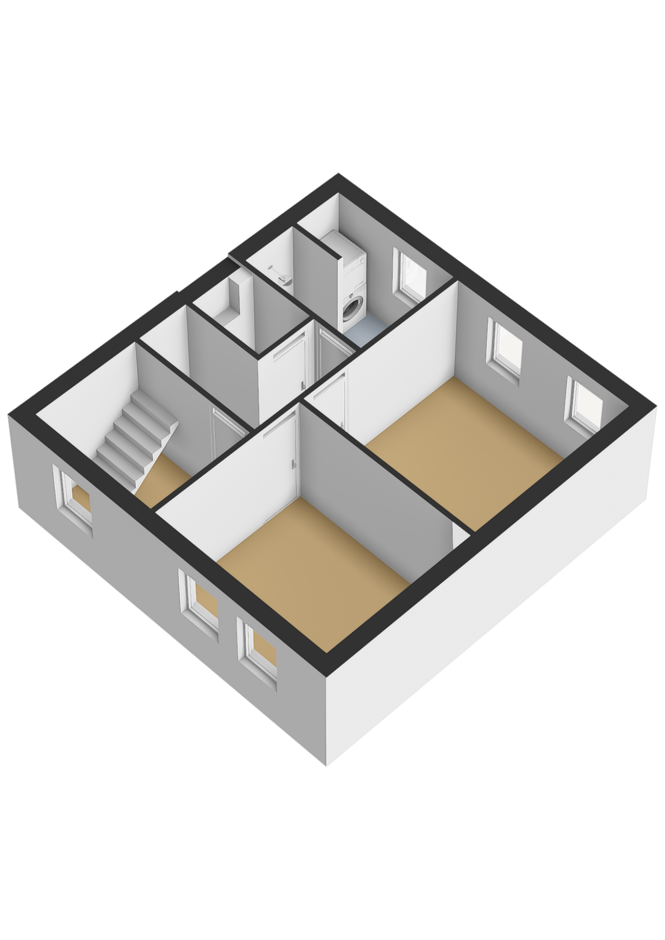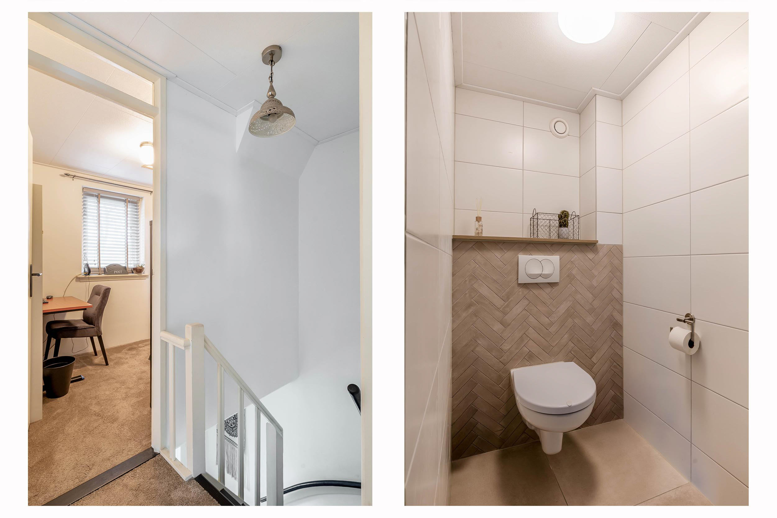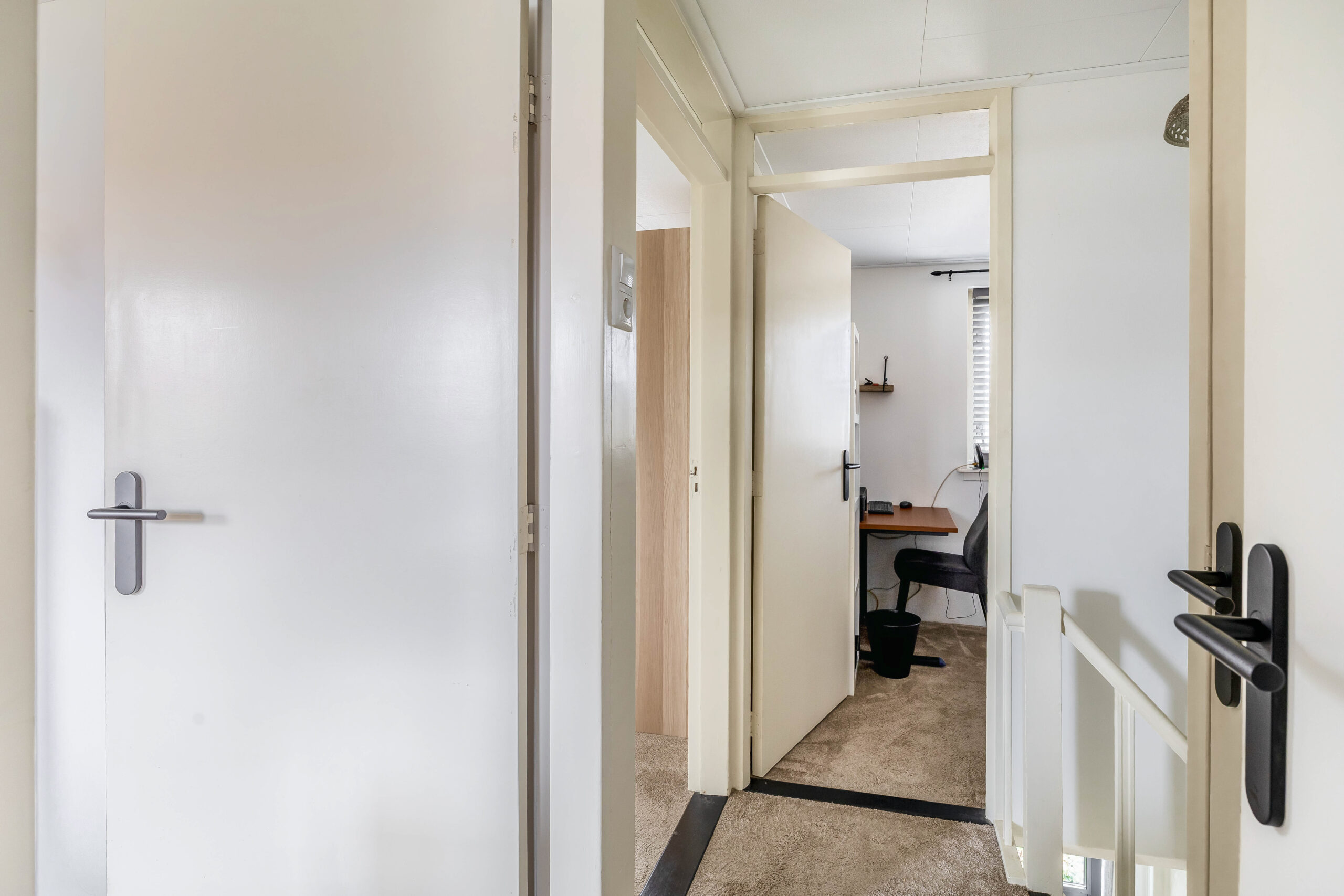 Overloop, toegang tot 2 slaapkamers, een werkruimte, toiletruimte met vrijdragend toilet en de badkamer. De luxe badkamer heeft een inloopdouche, wastafelmeubel en een wasmachine aansluiting. In de werkkamer bevindt zich een vaste trap naar de tweede verdieping.