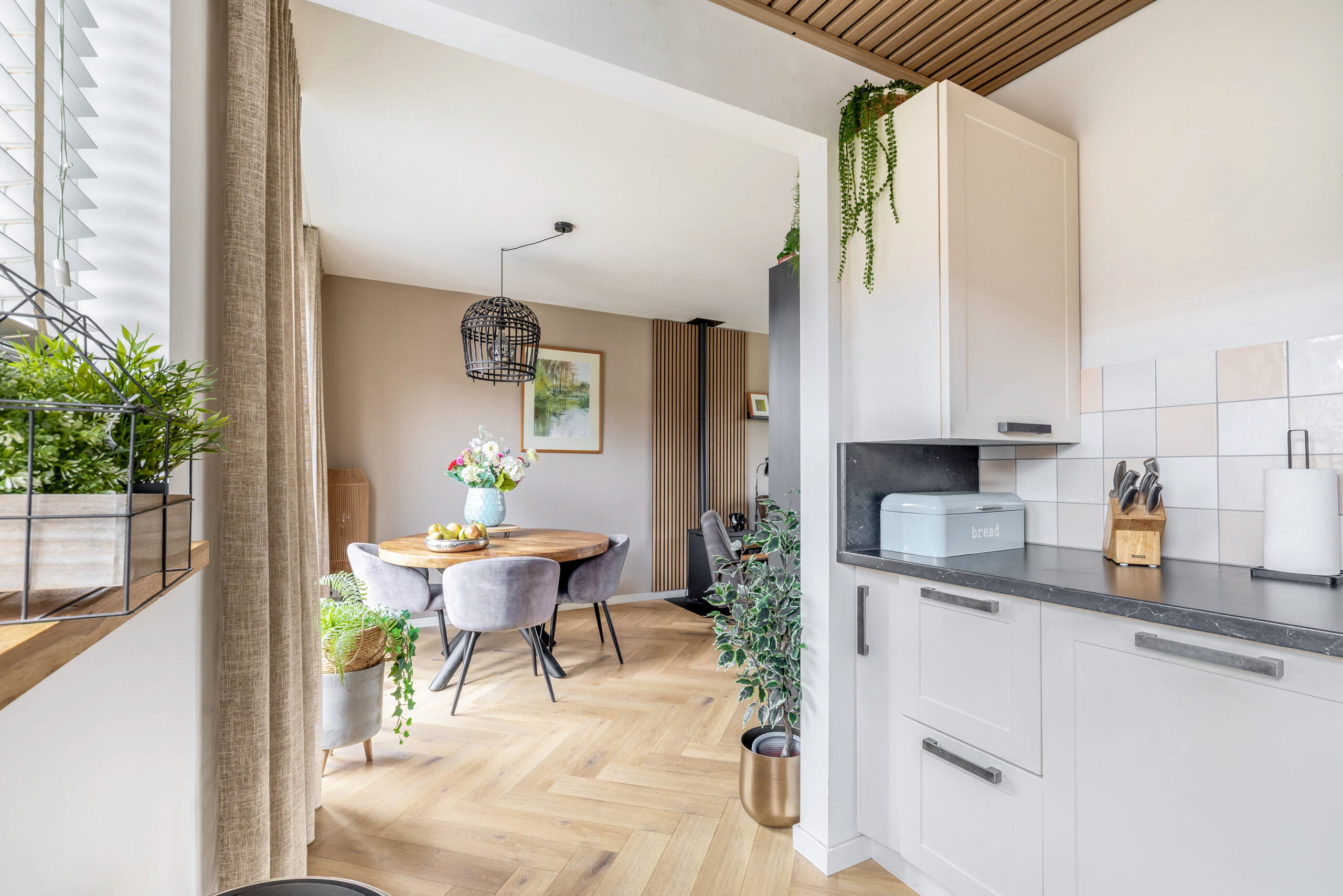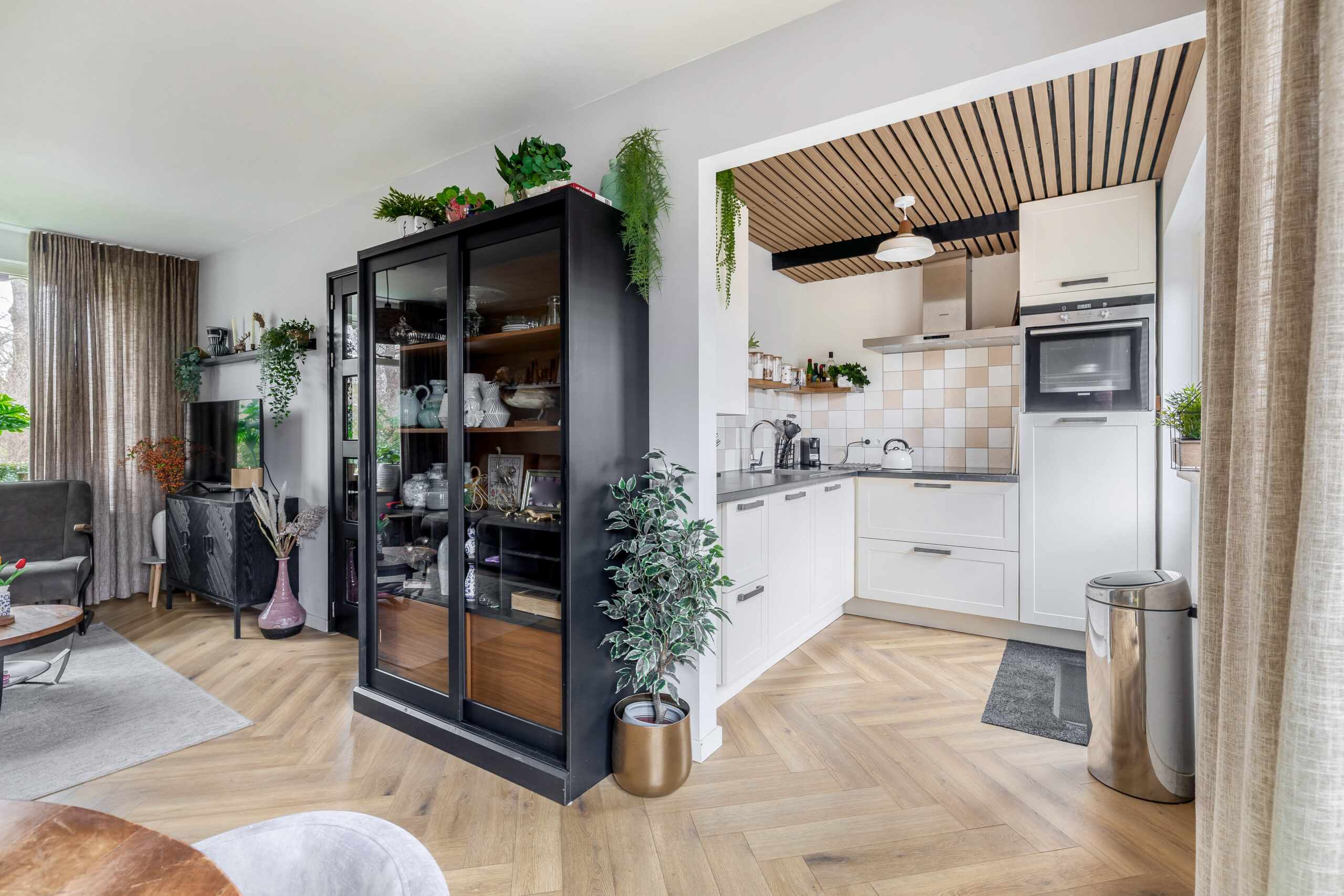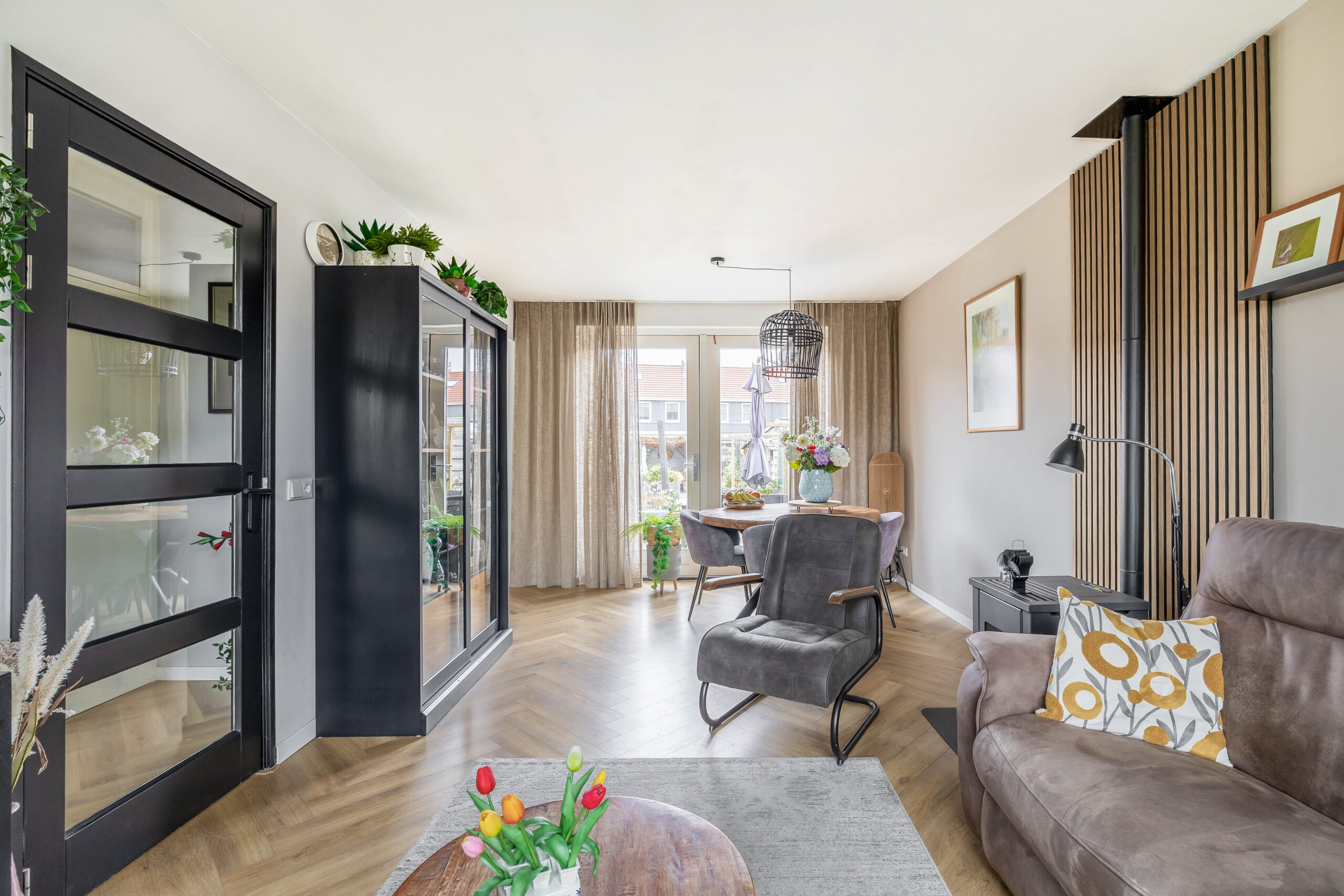 Binnen word je omarmd door een modern sfeervol interieur. De keuken is compact maar luxe afgewerkt. Door de openslaande tuindeuren stroomt het daglicht naar binnen en loop je zo je strak aangelegde achtertuin in.
