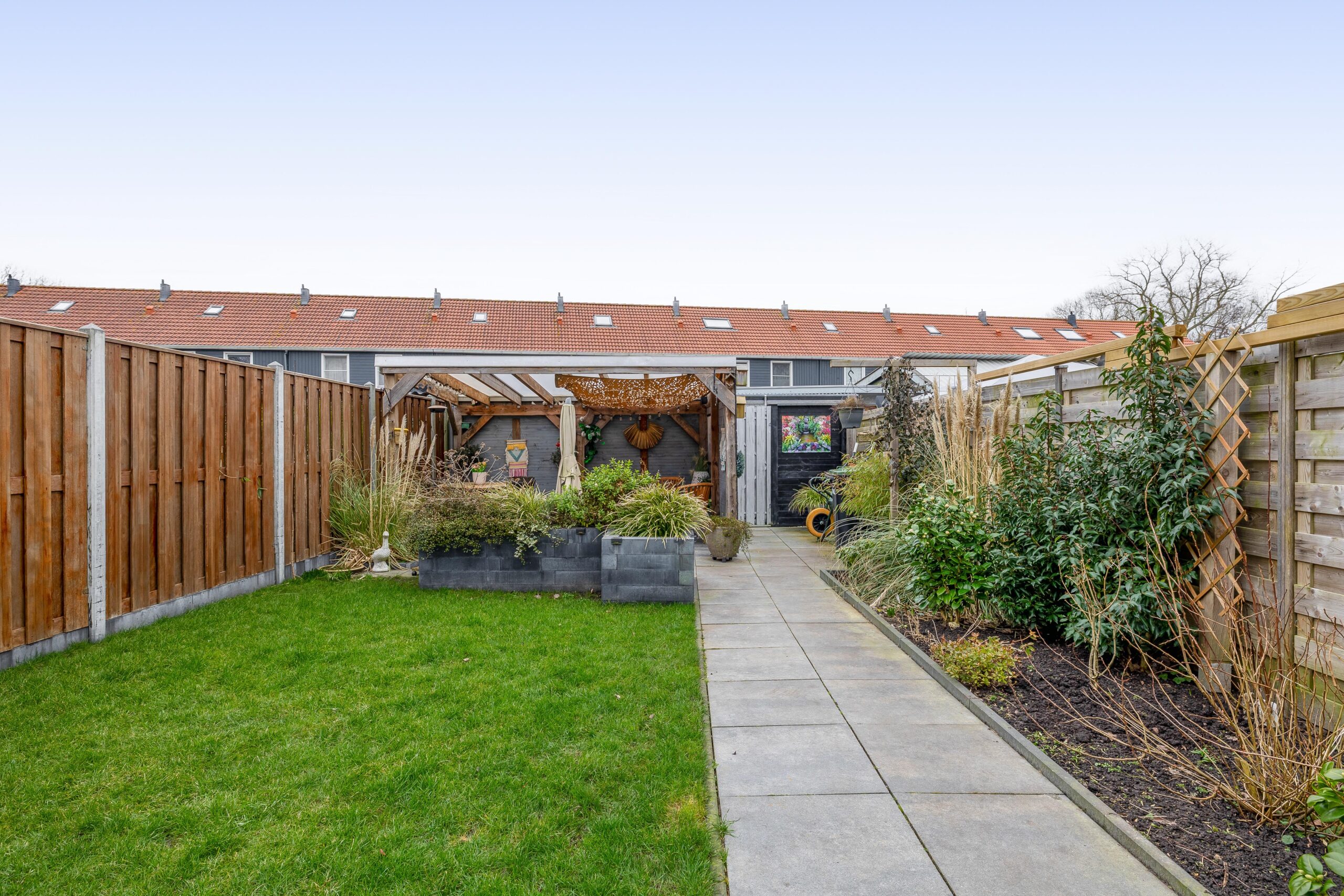 Zeer diepe achtertuin welke voorzien is van gazon, borders, vaste planten bak, vrijstaande stenen berging en een houten overkapping.