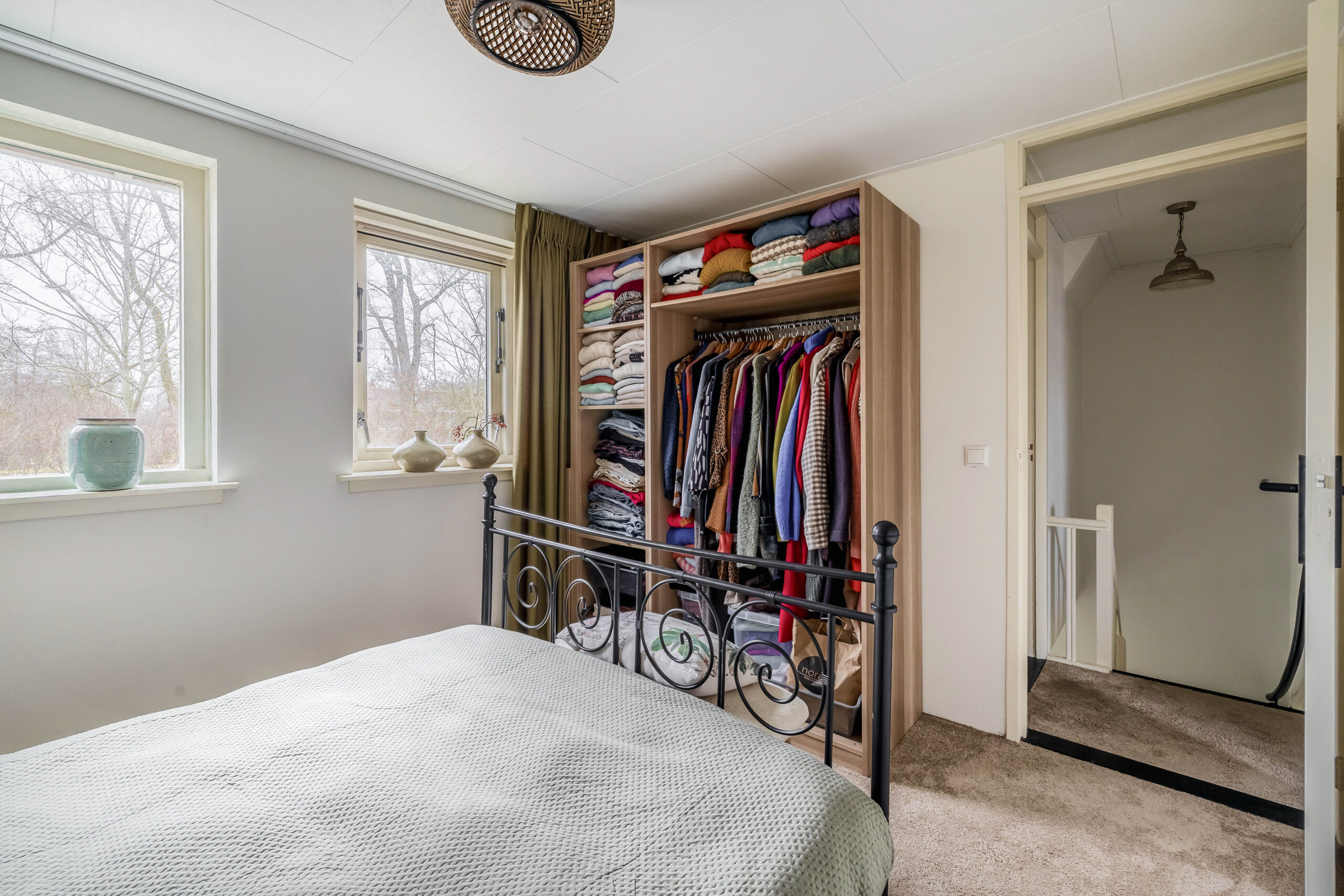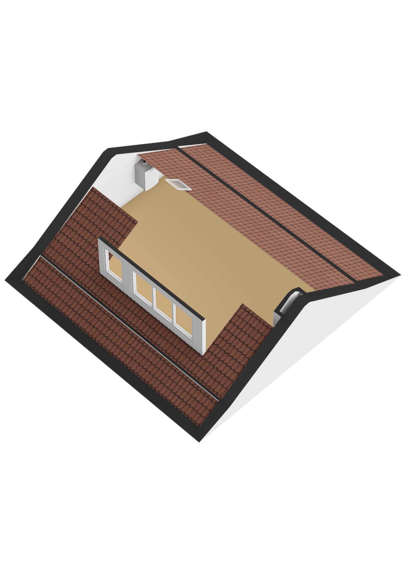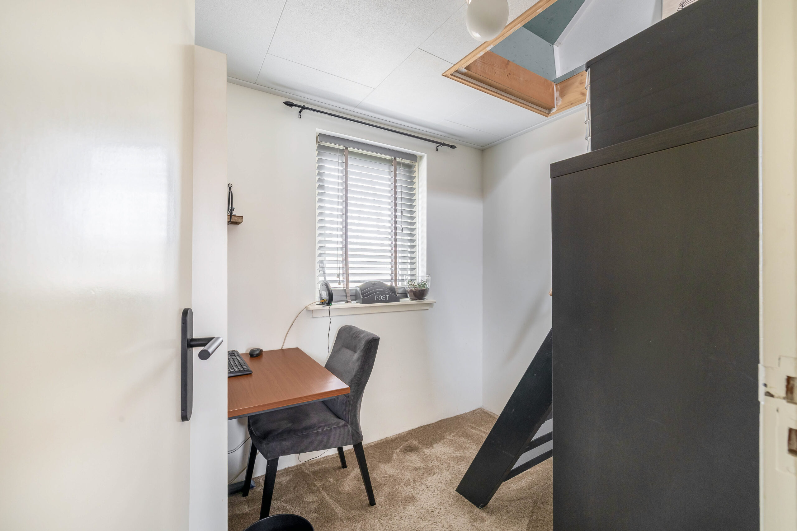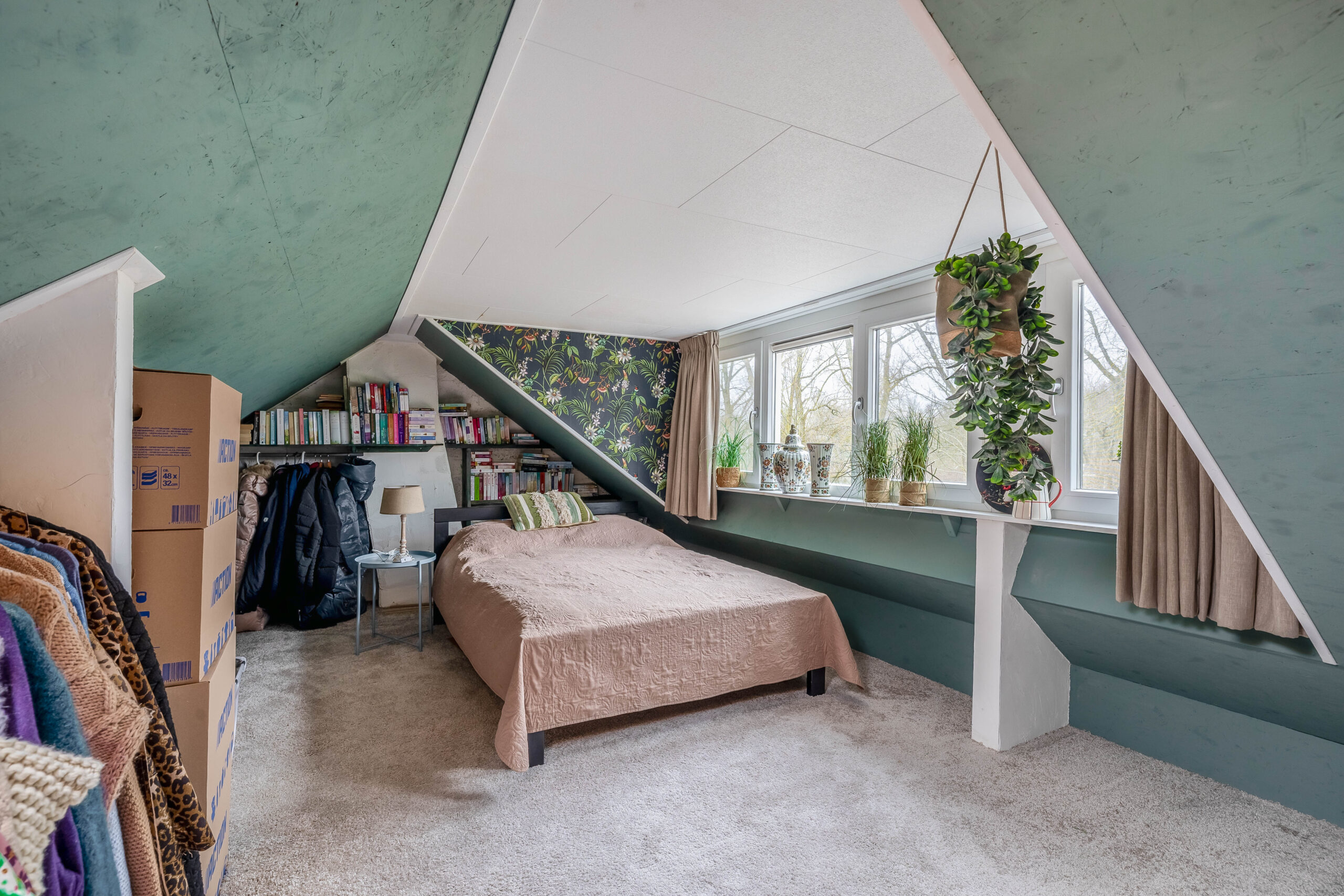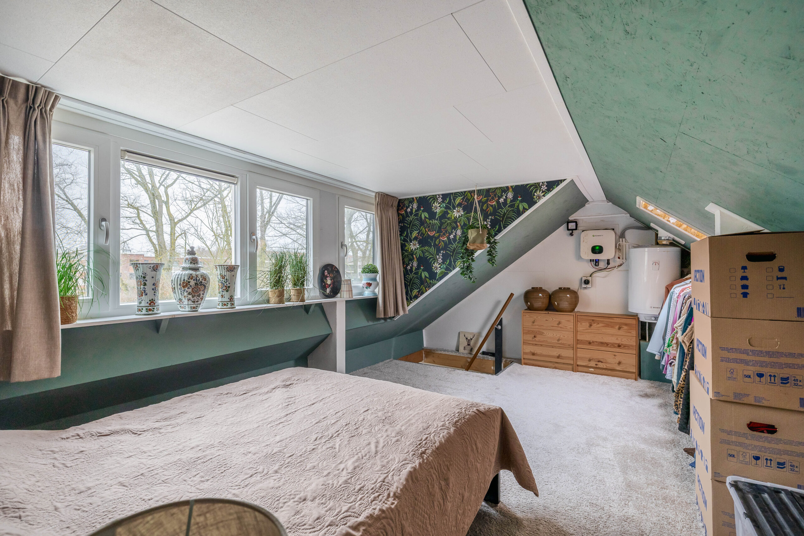 Slaapkamer met dakkapel aan de voorzijde, opstelling van de boiler en omvormer van de zonnepanelen.
