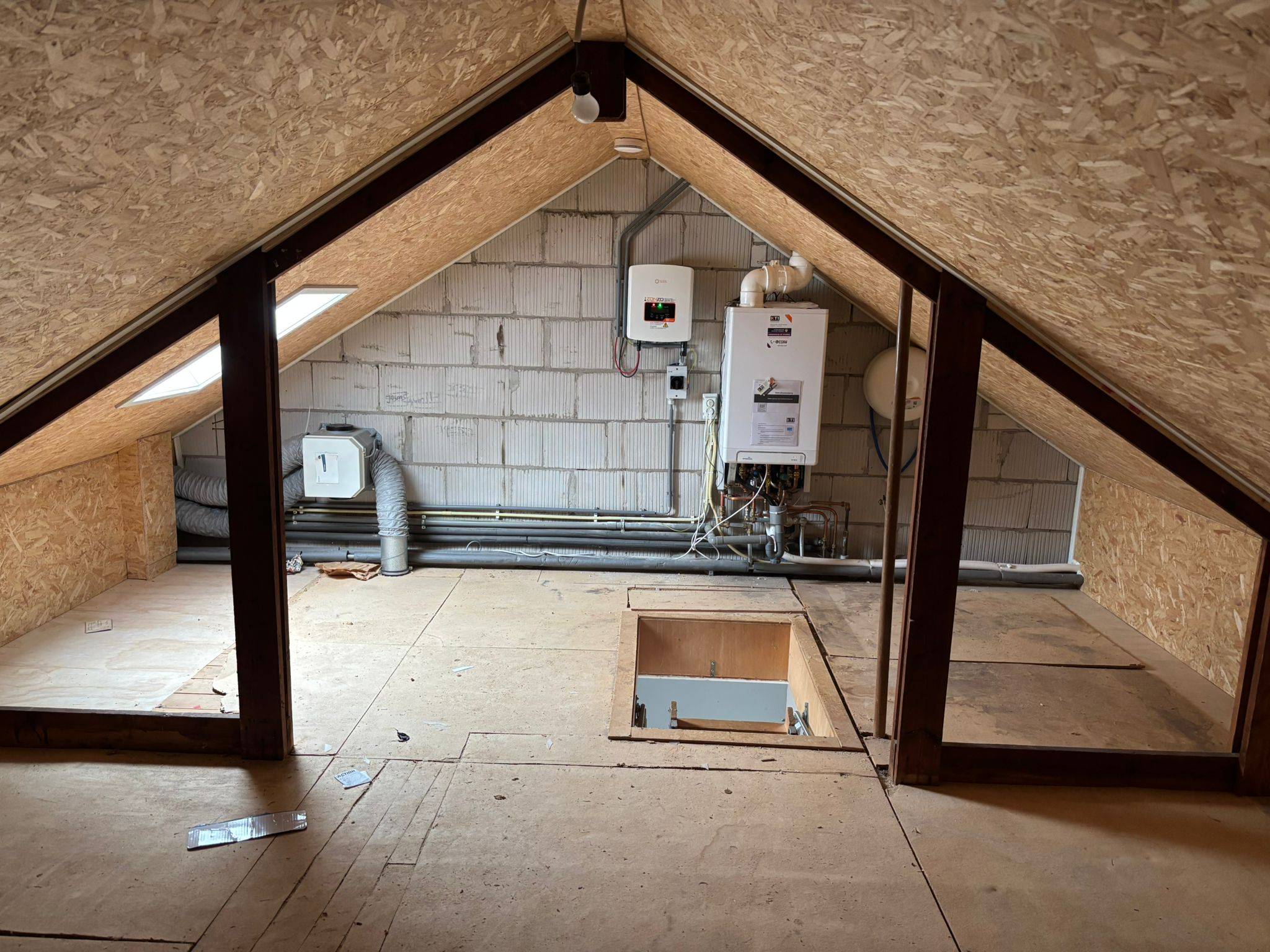Op de eerste verdieping bevinden zich drie slaapkamers en een volledig betegelde badkamer. De tweede verdieping is bereikbaar via een schuiftrap en biedt een ruime bergzolder met de opstelling voor de CV, hybride luchtwarmtepomp en zonnepanelen.