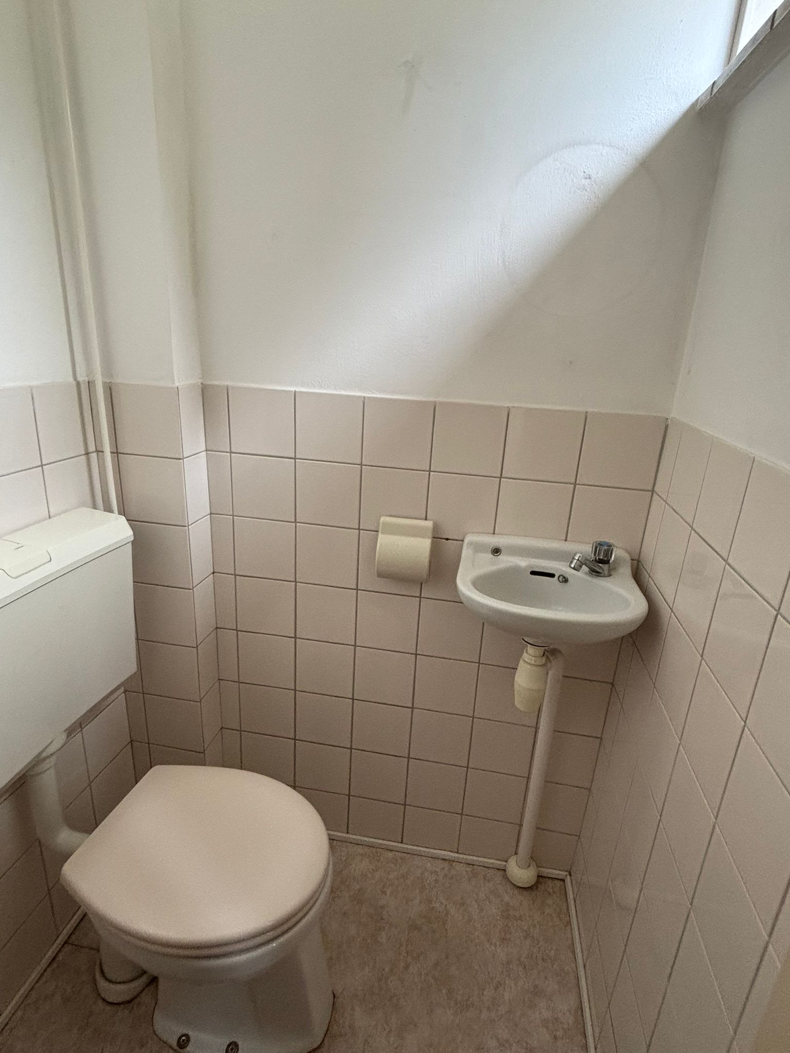 Begane grond: entree met trap naar de eerste verdieping, trapkast, meterkast en deels betegelde toiletruimte met toilet en fontein, dichte keuken met toegang tot de tuin, doorzon woonkamer.
