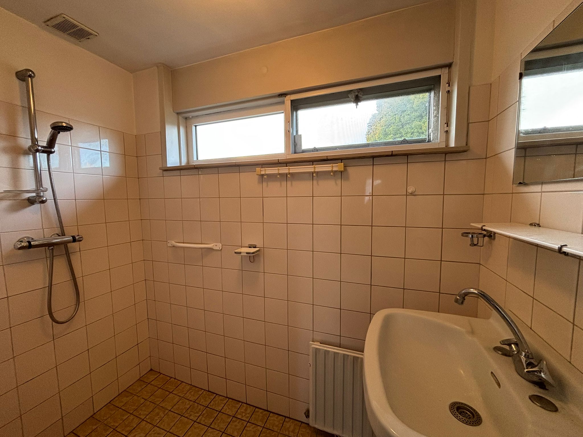 1e Verdieping: Overloop met zachtboard plafond, grotendeels betegelde badkamer met wastafel en douche, 3 slaapkamers met zachtboard plafonds.