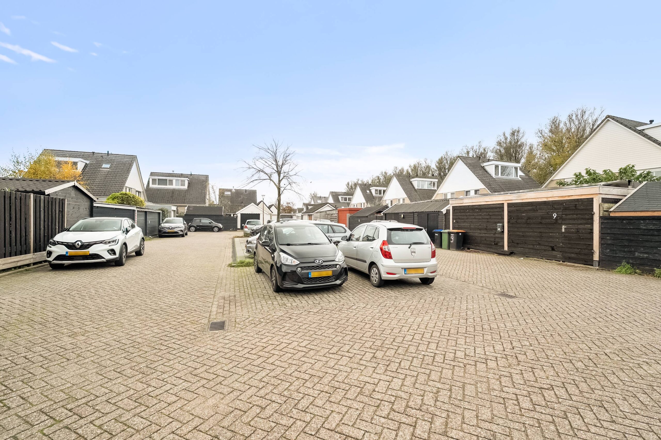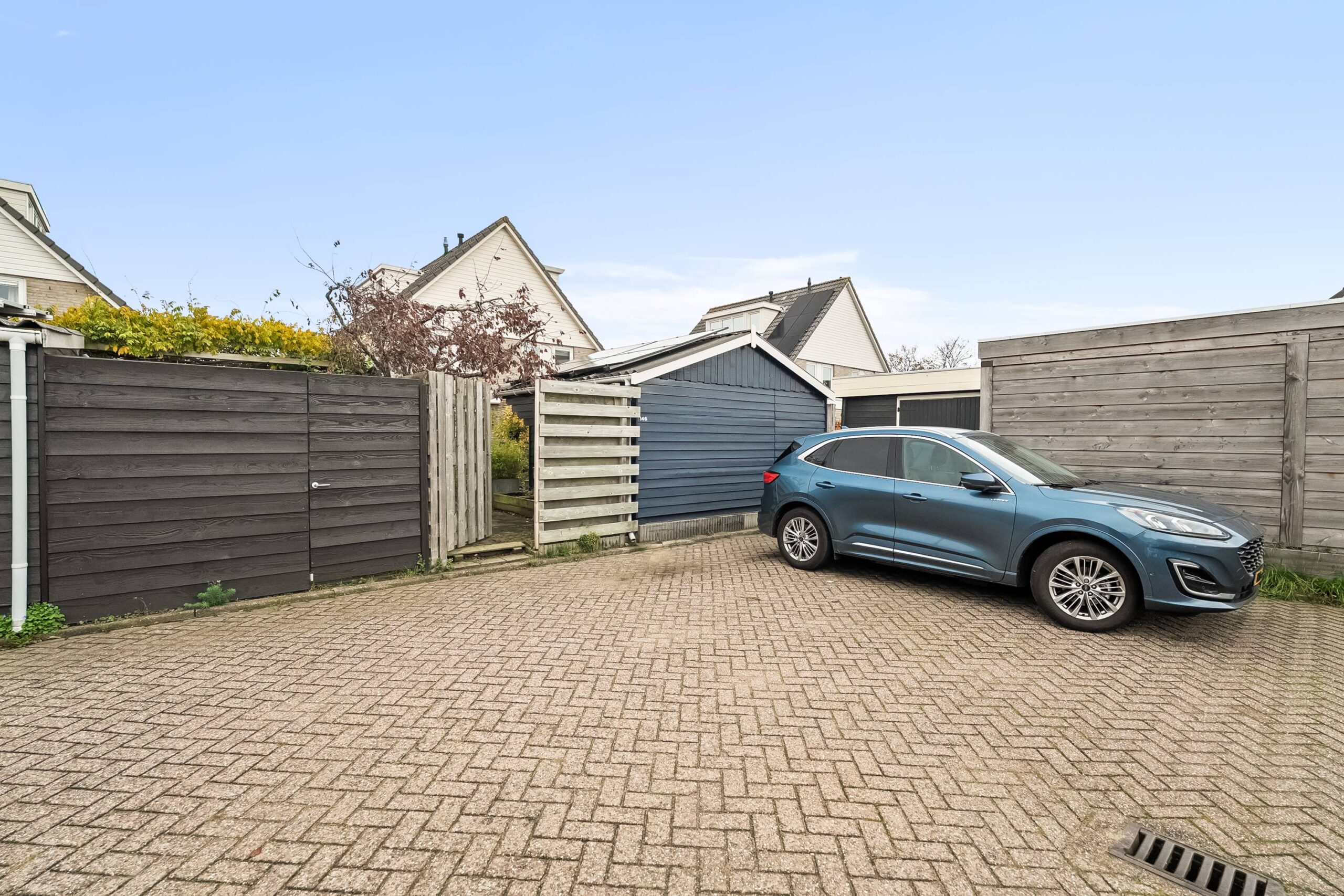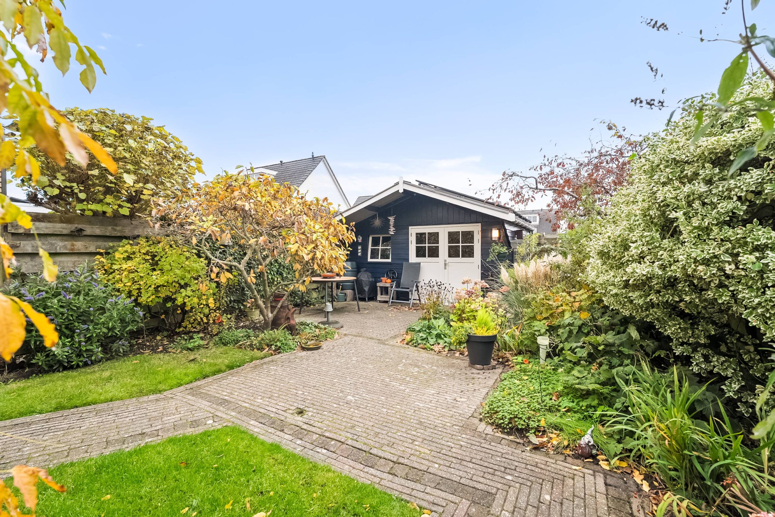 Achtertuin gelegen op het zonnige zuiden. Vrijstaande houten berging met elektra en opstelling van de omvormer van de zonnepanelen.
